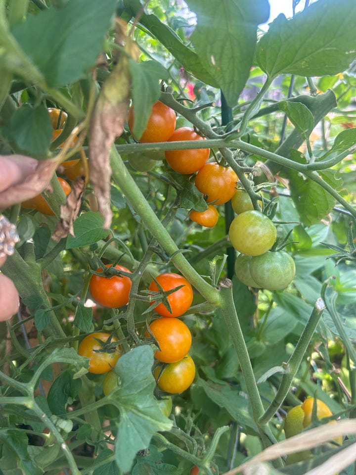 I have a small area at my friend’s house where I am growing things, and yesterday there was a bounty of tomatoes, flowers, and a butterfly.
