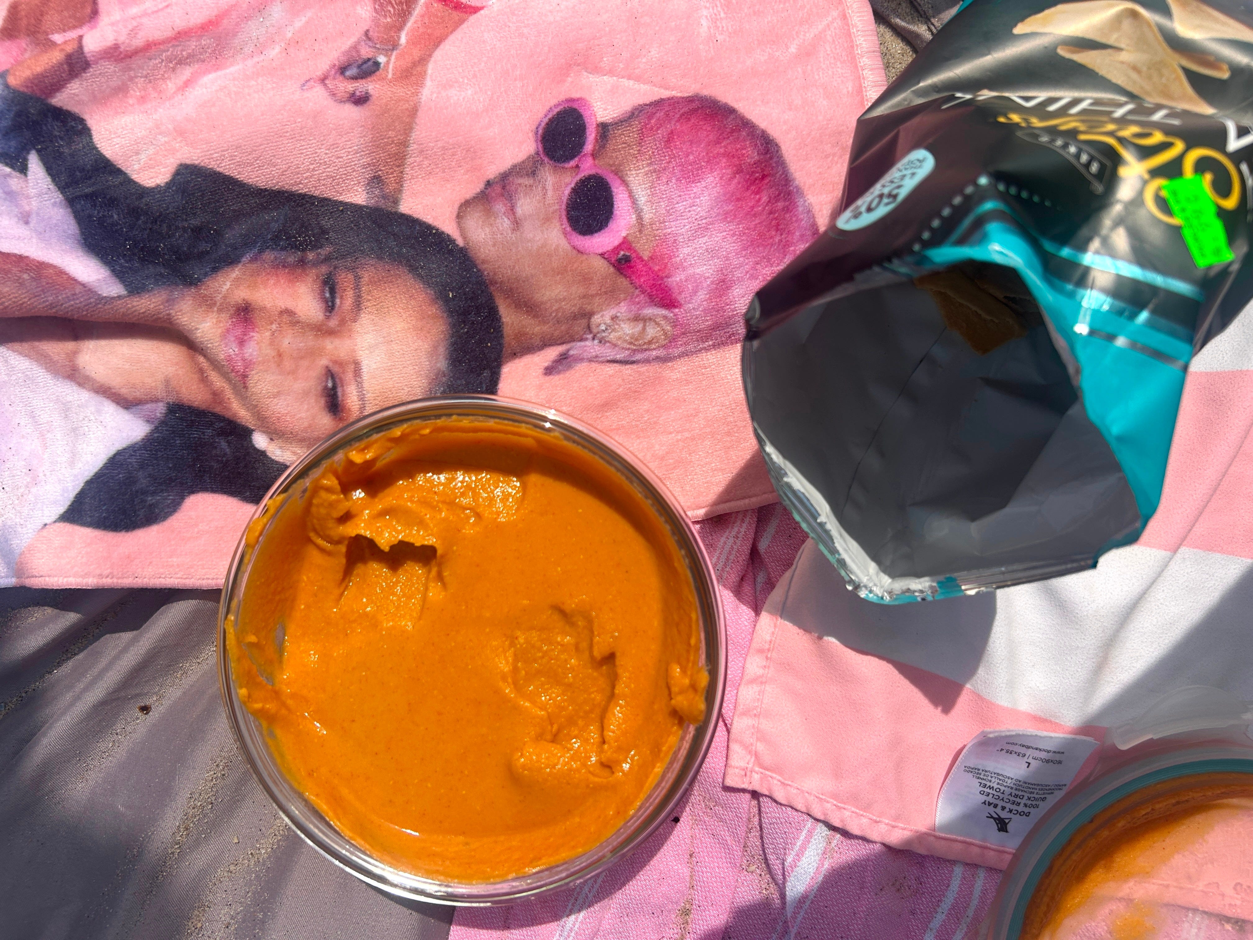Yesterday, at the beach, I brought a Smoky Red Lentil Dip with pita chips, and someone had a Rihanna towel. Life can be good.